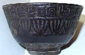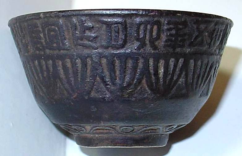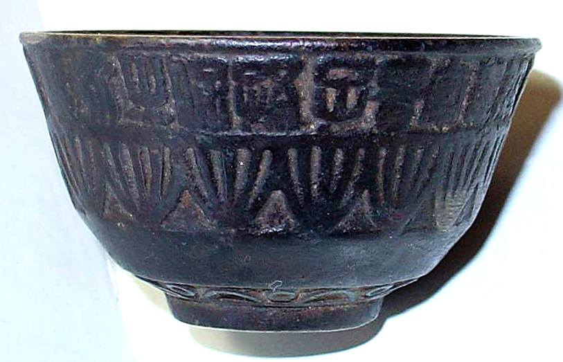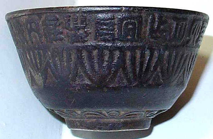 Можно реконструировать надпись в первом приближении как: «В шестой месяц пятого года правления под девизом Чжи Чжэн Великой династии Юань, некто, может быть, И Ма, носящий титул Хоу, изготовил эту драгоценную пиалу, чтобы его дети (и внуки) использовали ее для питья».